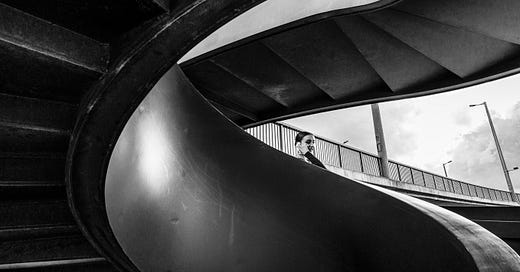 The spiral structure dominates the frame, leading the viewer's eye through its sweeping curve. It creates a sense of movement and rhythm, almost like a Möbius strip.